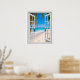 Havsvy fejkat fönster. Scenen Beach och handflatan träd, för en fönsterlös kontorsvägg. Roligt, realistiskt optisk illusionsscenk poster för ett kontor eller en studiekur.