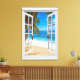 Blåhavsräka L'oeil Bild med falsk fönstervisning. Fotooptisk illusion, speciell effekt, med öppet fönster och vackert tropiskt havsvy.