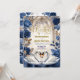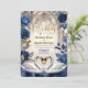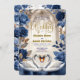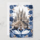 Transport your guests to a realm of majestic romance with this Gothic cathedral design. Featuring royal swans and deep indigo roses for a fairytale union.This design captures the essence of a high-fantasy romance set within the vaulted arches of a grand stone cathedral. The artwork features two majestic white swans meeting on a deep blue water surface to form a subtle heart shape, framed by a tiered stone fountain and a grand staircase. The color palette is dominated by deep navy and indigo floral borders, contrasted against creamy, off-white marble textures and faux bronze foliage. Typography pairs an intricate Gothic Blackletter font for names with an elegant gold-tone calligraphy script for details. This is a flat printed image with a faux gold foil and marble effect, not actual raised metal or stone material.