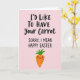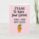 This card features a soft pastel pink background with a cheeky Easter message centered near the top, mixing large, flowing lettering with smaller, neat print beneath it. The main line reads “I’D LIKE TO HAVE Your Carrot” in dark text, and just below it “SORRY, I MEAN HAPPY EASTER” appears in a simpler style, also in dark lettering, like a quick, flustered correction. Under the words, a bright orange carrot character stands alone, adding a sweet, flirty tone as if it’s offering a shy grin to someone special 🐰. Its leafy top is a fresh green, and the face is minimal with two tiny black eyes, a curved smile, and a soft blush on the cheeks that suggests a tender, friendly crush. Fine horizontal lines across the carrot give it a natural texture without cluttering the design. The spacing leaves plenty of open pink around the text and character, keeping the focus on the playful wordplay and the bashful expression 🌷. The carrot sits beneath the centered text, with its green leaves pointing upward against the pink background.