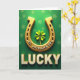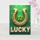 This card features a polished golden horseshoe centered on a deep emerald green background, setting a cozy St. Patrick’s Day scene with a touch of romance and friendship 💚. Nestled inside the horseshoe, a four-leaf clover opens like a small gift, with each leaf shifting through soft green shades that feel fresh and inviting ☘️. The horseshoe’s curved edges catch the light in a way that suggests a gentle, protective embrace around the clover. Behind it all, the green backdrop has a subtle pattern of lighter shamrocks, giving the surface a textured look without stealing attention from the main image. Along the top curve of the horseshoe, the text “ST. PATRICK’S DAY” appears in raised gold letters that follow the arc neatly. Beneath the horseshoe, “LUCKY” sits centered in matching gold, slightly dimensional, and easy to spot at a glance. Soft lighting creates mild shadows around the horseshoe and clover, while the background shamrocks remain faint and evenly spaced across the green field.