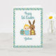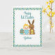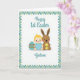This card shows a soft digital illustration on a bright white background, centered on a round-cheeked baby with fair skin and small tufts of golden hair in a sky-blue outfit. Nestled close beside the baby is a long-eared brown bunny 🐰, angled inward as if keeping gentle watch, while it holds a tiny yellow chick in its paws like a shared secret between friends. To the right sits a decorated egg with teal stripes and deep brown accents, balancing the scene with a festive touch. The lighting looks diffuse and gentle, giving the figures smooth, rounded shading and a calm, cozy look. A border of alternating teal and mint diamond shapes frames the picture, adding a neat geometric edge without crowding the characters. Aquamarine lettering appears above and below the main illustration, set in flowing cursive-style text that feels light and airy, like a note exchanged in spring 🌷. The baby’s cheeks show a rosy blush and the bunny’s eyes have a small bright glint.