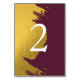 En elegant- och klassyfaux-guld-penselformering med burgudisk bakgrund. Denna enkla kombination av färg skapar ett sofistikerat, trendig och chic stil. Utformningen av bordsnumret i elegant bröllop med det moderna inslag. Den enkla uppställningen av typografin ge är ett distinkt stil. Det finns också möjlighet att matcha bröllopsinbjudningar och andra artiklar i kontorsartiklar. Anpassa antalet och köp varje bord individuellt beroende på hur många bordsnummer du behöver.