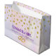 En personlig presentpåse med påhittade guld-konfektyrer sprinkled längs toppen. 2 guldfärgat bröllop ringar under personligen. En vattenfärgsbakgrund för blekens lila och gult.