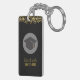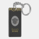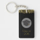 En nyckelkedja som säger: Klass 20xx. Baksidan kan vara personlig med ditt namn och telefonnummer eller annan text. Designad med guld konetti glitter. Ställ in på en svart bakgrund. Illustrerad med en svart studentmössa med en halvgenomskinlig cirkel bakom. Elegant och chic.