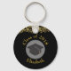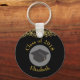 En nyckelkedja för personlig som säger: Klass 20xx. Designad med guld konetti glitter. Ställ in på en svart bakgrund. Illustrerad med en svart studentmössa med en halvgenomskinlig cirkel bakom. Elegant och chic.