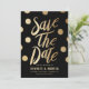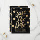 Meddela er bröllop-dejt med anpassadet spara datum meddelande. Den har faux guld foil-konetti-punkter och modern typografi på bakgrunden. Om du anpassar den här faux-guld-folien sparar du datumkortet genom att lägga till namn, datum, plats och annan information. Det svarta och guld sparar datumkortet är perfekt för det moderna bröllop.