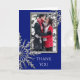 Anpassa eleganten Faux Silver Snowflake på Blue Tackkort Photo Card inuti och ut. Lägg till bild på utsidan och lägg även till er egen tacksamhet, uppskattning och tacksamhet. Lämplig för använda för gåvor som tas emot vid jul- eller vinterfödelsedag, möhippa, förlovningsfest eller bröllop. Den här tackkort-fotokortet i anpassningsbar- och lektidformat har en intrikad silver-ton snöflingor som fäster hörnen med rikens blå bakgrund.