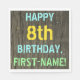Den här födelsedagsfesten med roligt napkin har ett meddelande som "LYCKLIG 8:e BIRTHDAY, FÖRSTA-NAMN!", där namn kan vara personlig. Bakgrunden har ett strålande, brunt, faux-trönans utseende mönster. Personligens meddelandetext har färg som blått, gult och grönt, och det ser ut som om det är färgat, med stencilerat tryck. Napkins som dessa kan kanske användas i en födelsedagsfest till någon som firar sin åttonde födelsedag. [~Z0000292]