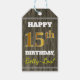 Den här märkrn med födelsedagspresent innehåller ett meddelande som "LYCKLIG 15:e BIRTHDAY, Betty-Lou!", där namn kan anpassas och där siffran "15:e" har ett utseende som liknar guld. Den har också en bakgrund med rustiskt utseende på träet. Baksidan har en Från:-linje. Märkre av födelsedagspresent som dessa skulle kanske kunna användas för gåvor som ges till någons femtonde födelsedag. [~Z0000160]