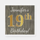 Den här enkla pappra napkin-designen innehåller ett meddelande som "Jennifer's 19:e födelsedag!", där "19:e" har ett faux-guld-liknande utseende, på en fin träbakgrund. Namn kan anpassas. Den skulle kunna användas i en födelsedagsfest till någon som firar sin nittonårsdag. [~Z0000084]