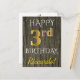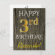 Den här enkla vykortsdesignen för personligens födelsedag innehåller meddelandet "LYCKLIG 3:e BIRTHDAY", där "3:e" har ett utseende som liknar guld. På framsidan finns också en personlig namn, och ett faux wood-utseende. Baksidan innehåller ett meddelande om personligens födelsedag, tillsammans med anpassadet adress för mottagaren av födelsedagskort. Det skulle kunna ges till någon som firar sin tredje födelsedag. [~Z0000066]