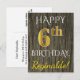 Den här enkla vykortsdesignen för personligens födelsedag innehåller budskapet "LYCKLIG 6e BIRTHDAY", där "6e" har ett faux guld-liknande utseende. På framsidan finns också ett eget namn och en ytlig träbakgrund. Baksidan innehåller ett anpassat födelsedagsmeddelande, tillsammans med anpassadet adress för mottagaren av födelsedagskort. Det skulle kunna ges till någon som firar sin sjätte födelsedag. [~Z0000066]