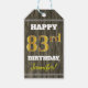 Den här märkrn med födelsedagspresent innehåller ett meddelande som "LYCKLIG 83:e BIRTHDAY, Jennifer!", där namn kan vara personlig och där siffran "83:e" har ett faux/imitation guld-liknande utseende. Den har också en bakgrund med rustiskt utseende på träet. Baksidan har en Från:-linje. Märkre av födelsedagspresent som dessa skulle kanske kunna användas på gåvor som ges till någons åttio tredje födelsedag. [~Z0000160]
