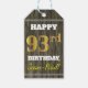 Den här märkrn med födelsedagspresent innehåller ett meddelande som "LYCKLIG 93:e BIRTHDAY, Jean-Paul!", där namn kan vara personlig och där siffran "93:e" har ett utseende som påminner om guld. Den har också en rustik träbakgrund. Baksidan har en Från:-linje. Märkre av födelsedagspresent som dessa skulle kanske kunna användas på gåvor som ges till någons 90-dagars födelsedag. [~Z0000160]