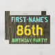 I födelsedagsfest inbjudan i roligt finns ett meddelande som "FIRST-NAMN's 86:e FÖDELSEDAGSFESTEN!", där namn kan vara personlig, på framsidan. Bakgrunden har ett strålande, brunt, faux-trönans utseende mönster. Anpassadets meddelandetext på framsidan har färg som blått, gult och grönt, och det har ett utseende som inspirerats av målat, stencilat bokstäver. Baksidan innehåller ett personlig som kan innehålla relevanta uppgifter om födelsedagsfesten, t.ex. när och var den hålls, tillsammans med all annan viktig information. Födelsedagsfest inbjudan som detta kan vara ett roligt till inbjudan familj och vänner till en födelsedagsfest som hålls för någon som firar sin åttiosjätte födelsedag. [~Z0000291]