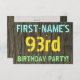 I födelsedagsfest inbjudan i roligt finns ett meddelande som "FIRST-NAMN:s 93:e FÖDELSEDAGSFEST!", där namn kan vara personlig, på framsidan. Bakgrunden har ett strålande, brunt, faux-trönans utseende mönster. Anpassadets meddelandetext på framsidan har färg som blått, gult och grönt, och det har ett utseende som inspirerats av målat, stencilat bokstäver. Baksidan innehåller ett personlig som kan innehålla viktiga detaljer om födelsedagsfesten, t.ex. när och var den hålls, tillsammans med all annan relevant information. Födelsedagsfest inbjudan som detta kan vara ett roligt till inbjudan familj och vänner till en födelsedagsfest som hålls för någon som firar sin nittiotredje födelsedag. [~Z0000291]