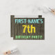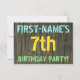 I födelsedagsfest inbjudan-roligten finns ett meddelande som "FIRST-NAMN's 7:e FÖDELSEDAGSFEST!", där namn kan vara personlig, på framsidan. Bakgrunden har ett strålande, brunt, faux-trönans utseende mönster. Anpassadets meddelandetext på framsidan har färg som blått, gult och grönt, och det har ett utseende som inspirerats av målat, stencilat bokstäver. Baksidan innehåller ett anpassat meddelande som kan innehålla viktiga detaljer om födelsedagsfesten, t.ex. när och var den hålls, tillsammans med all annan relevant information. Födelsedagsfest inbjudan som detta kan vara ett roligt till inbjudan familj och vänner till en födelsedagsfest för någon som firar sin sjunde födelsedag. [~Z0000291]