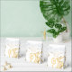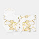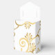 Shown is a tent style favor box in White with a fancy Golden-color printed heart pattern on it and floral-type print all over box. Embellished with a White ribbon at top. Newlyweds' names on each side of heart and the last name inside the heart.