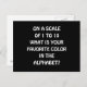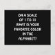 Här? s en konversationstartknapp. ? På ett fjäll av 1 till 10 vad är din favorit- färg i alfabetet?? Kontrollera ut denna roliga anpassad design på utslagsplatser, skjortor, muggar, pajamas, gåvor och annan dräkt.