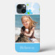 Det här telefonfodralet innehåller ditt favoritfoto på en blek med vattenfärgseffekt och himlar blå blomsterbakgrund. Fotoets vita ram är en del av designen och fotot placeras bakom ram. Det finns också ett blått block i söt himlar vid grund i telefonväskan för en personlig namn i ett vitt kritformat stil. Fungerar bäst med kvadratiska eller vågrät rektangulära bilder med mycket utrymme mellan subjekt och kant.