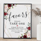 Blommor med burgunder och rosa rodnad bukett och guld geometrisk form som ramar in skriften "favor" och klassisk typografi "vänligen ta en" för bröllopsskylt.