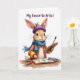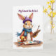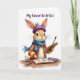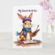 This card shows an upright, human-like rabbit artist 🐰 centered on a white background, wearing a purple beret with a small feather, an orange coat with yellow cuffs, and a blue scarf with yellow stripes, and its gentle, direct gaze feels like a fond look shared with someone close. In one paw it holds a painter’s palette and a thin brush, poised as if it’s about to add a careful touch meant for a special person. Below the character, an open sketchpad sits on a warm brown tabletop with loose splashes of color that read like a cheerful note between friends. A small paint set nearby shows many different colors arranged in tidy wells, with a few simple drawing tools placed alongside. Near the top, the phrase “My Favorite Artist” appears in flowing, cursive-style lettering in a dark tone that stands out clearly against the white space 🌷. Soft shading and light texture give the illustration a cozy, storybook look without crowding the scene. The tabletop area includes the open sketchpad, the paint set, and scattered art tools, all drawn with gentle gradients and small dabs of color.
