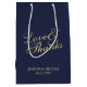 En marinblå och guld modern elegant snyggt med frasen "Kärlek & Tack" i guld calligraphy font stil med namn och date in elegant klassisk serif font guld på marinblå bakgrund i stil. Observera att folieinformationen simuleras i teckningen. Ingen faktisk folie kommer att användas vid skapar av denna produkt.
