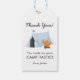 Födelsedagsfest för barn av kute-campingtema med blått tält med brinnande eld bredvid. I texten står det: "Tack! Du gjorde min party-taktik!" Anpassa den här produkten genom att lägga till ditt barns namn vid grund. Underbar för pojkens party.