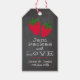 Rustik svart tavla med enkel typografi och ett par illustrerade jordgubbar ger denna presentetikett en söt och enkel känsla.