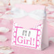 Vi firar att du kommer hit med de här festliga babyduschpartierna. Den här designen innehåller texten "Det är en flicka!" i färg av svart och rosa med rosa och vit cirkel i mönster.