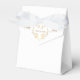 Visad är en tält stil-favoritlåda i Vita med ett finare Golden-färg tryckt hjärta mönster på den. Förbannat med ett vitt band överst. Newlyweds namn på varje sida av hjärtat och efternamnet inuti hjärtat. Konstruktion på överdrag. Anpassa det här objektet eller köp som det visas.