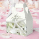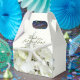Vit bröllopsaffär med stjärnfisk och vattendesign. En del av den vita Seaside Garden-utformningen, verkliga blommor och havstjärnorna trycks på båda sidor över ett benvitt färg. Anpassa texten överst, nära handtaget, för att tacka gästerna för att de har deltagit i en mottagning före bröllopsfest eller bröllop. Utformningen av blommigten för söt är perfekt även för möhippor. Lådorna viks av köparen. Läs mer om produkten i beskrivningen nedan.