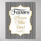 En elegant svart och guld Favors-skylt som säger "Favoriter, ta en". Den har svarta och vita ränder och en ram med guldglitter. Den perfekta partydekorationen för din bröllop, baby shower eller bröllopsfest. Fler bordsskyltar finns i min butik.