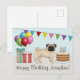 Desteis originalillustration av en söt fawn-färgad Pug-ras hund. Hunden är placerad i en färgglad födelsedagsmiljö. Det finns en födelsedagstårta med några ljus på, färgglada födelsedagsballonger och en flaggbanner samt två presentlådor. Det finns också ett personligt textfält.