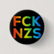 FCK NZS ist ein deklares Påstående gegen Nazis und Faschisten. Nie Wieder ist JETZT. Regenbogen-Schrift auf weißem Grund.
