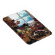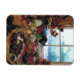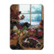 Det här fotot är en bild av en fest på en bord. Ljuset som kommer genom fönstret visar is på fönstret. En mängd grönsaker, frukt och efterrätter är redo för firande. Dessa magneter komar i olika former och storlekar.