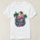 En pulserande design med en flamande flamingo som står på ett ben, bär ett belagt halsband och en fjädrad Mardi Gras-mask. Mot en tropisk bakgrund med handflatan träd och en gyllene solnedgång är denna utformning perfekt för party älskare och fläkt av tropiska viber.