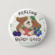 A cute illustration of a dog holding various berries in his arms with the text "FEELING BERRY GOOD"