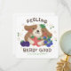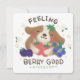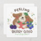 A cute illustration of a dog holding various berries in his arms with the text "FEELING BERRY GOOD"