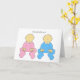 Två dubbla tecknader spädbarn, en i rosa och en i blått, med ord"Félicitations", som översätts till"Grattisar.