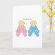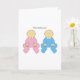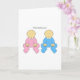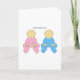 Två tvilling- tecknadbebis, en i rosor och en i blått, med ord "Félicitations".