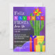 Feliz Navidad Fiesta inbjuds med en ljus grönt cactus dekorerad med en mexikansk julprydnad på översta och färglösa presentboxar. Har ord NAVIDAD på papel picado (violett, blå, grönt, mexikansk rosa, orange, lila och röd). Det är en glatt och skarp design på ett lila-violett yta. Fira din mexikanska jul party med festlighet och ljusa färger.