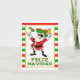 Den här roligten Julhälsningar kort med tecknad Jultomten i den förestående mexikanska sombrero och textbilden "Feliz Navidad" i rött, grönt och gult på röd, vit och grönt rand bakgrund. Perfekt för la familia y amigos. Enkel att anpassa med alternativ för anpassningsbar.