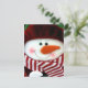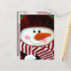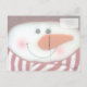 Ett foto på ett vykort från snögubbe helgdag. Snögubbe bär röd och vit strimlad scarf och röd hatt. Den namnteckning orangen är också där, med lite på kindorna.