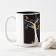 Fem vackra orangar i abstrakt hänger i ett vitt träd mot en svart bakgrund på mugg. Bilden finns på båda sidor om mugg.