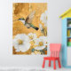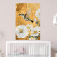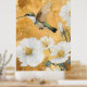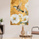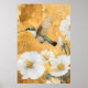 The image is a watercolor and mixed-media painting. It utilizes soft brushstrokes for the bird's plumage and a textured, gold-toned background that may incorporate elements like gold leaf or specialized ink washes to create a shimmering effect