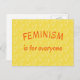 Budskapet är "FEMINISM är till för alla", i skarp orange på en livfull gult. Detta förstärks med ett upprepande mönster med hjälp av en halvtransparent manlig-kvinnlig symbol.