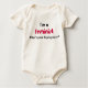 "Jag är feminist, vad är din supermakt?" En roligt slogan med ett allvarligt budskap till ett sött baby. Sloganen är i fet svart text, med "feminist" i djup rosa för kontrast.