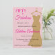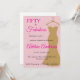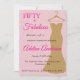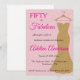 Femtio och fantastisk minimal rosa, guld och svart modern 50-års inbjudan som du kan anpassa och skicka ut för din femtioårsfirande. Orden "Femtio och fantastisk" är satta på en rosa bakgrund, med populär het rosa skript typsnitts typografi, placerad bredvid en elegant, sofistikerad guld strapless aftonklänning.